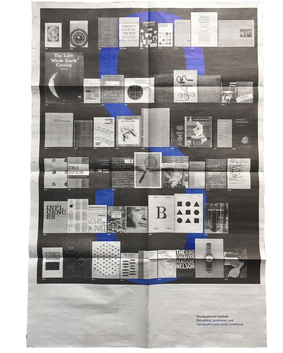 The Southland Institute is an unaccredited two-year postgraduate graphic design workshop and evolving public online repository of educational resources, built around a central curricular helix consisting of the tools, processes, histories, and discourses of typography, graphic design and critical art-making. It is also intended to be a forum for inquiry into the processes, potentials, and complications of education and its attendant structures and systems.
